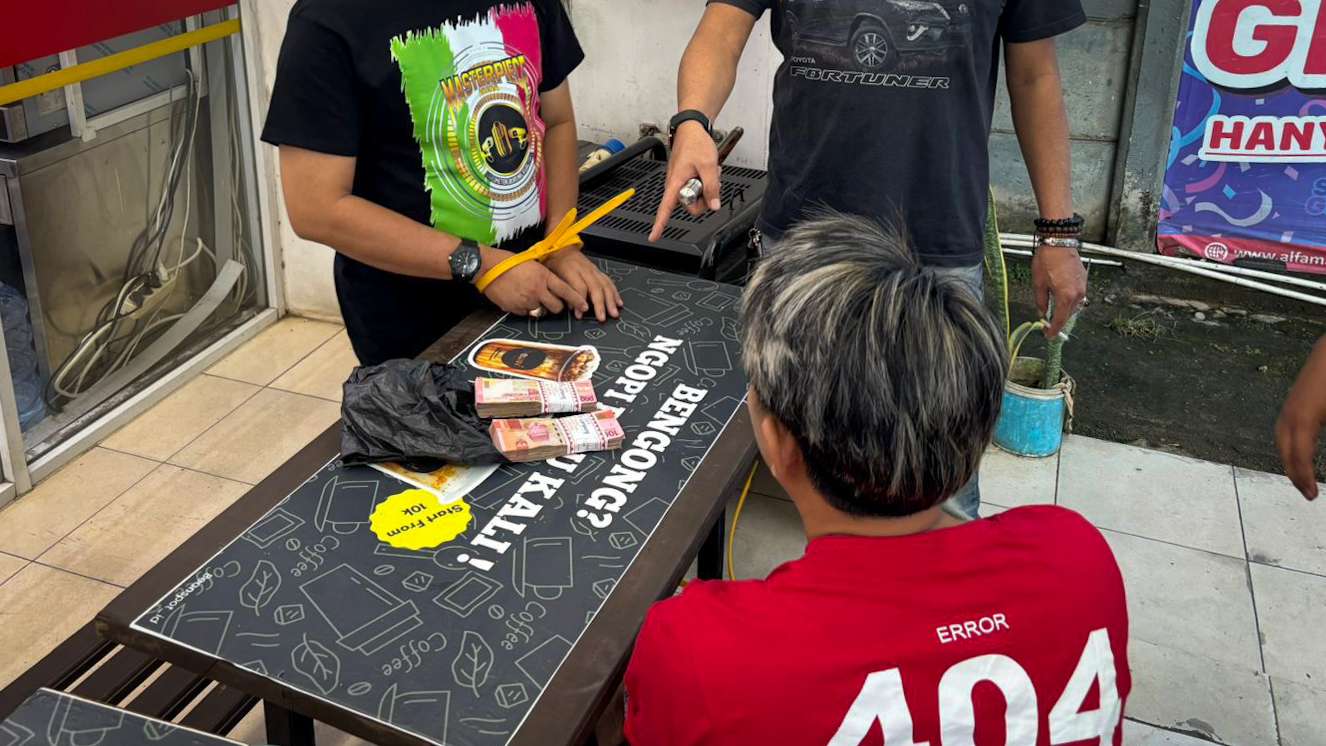 Ketua LSM, WYD (kiri), bersama anggotanya FJR (kanan), dengan barang bukti sejumlah uang di atas meja tertangkap tangan aparat (tengah) di sebuah minimarket di Bandar Lampung, Minggu (21/9/2025). Foto: Istimewa