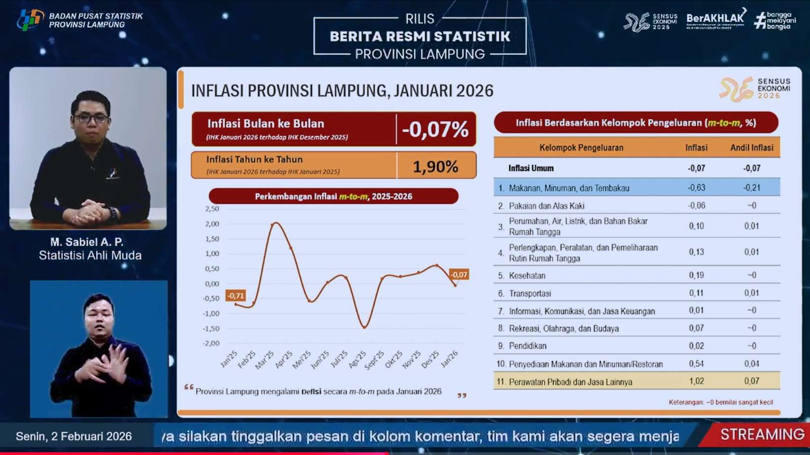 Statistisi Ahli Muda BPS Provinsi Lampung, M. Sabiel, dalam laporannya menyampaikan bahwa secara bulanan (month-to-month), Provinsi Lampung sebenarnya mengalami deflasi sebesar 0,07% pada Januari 2026.