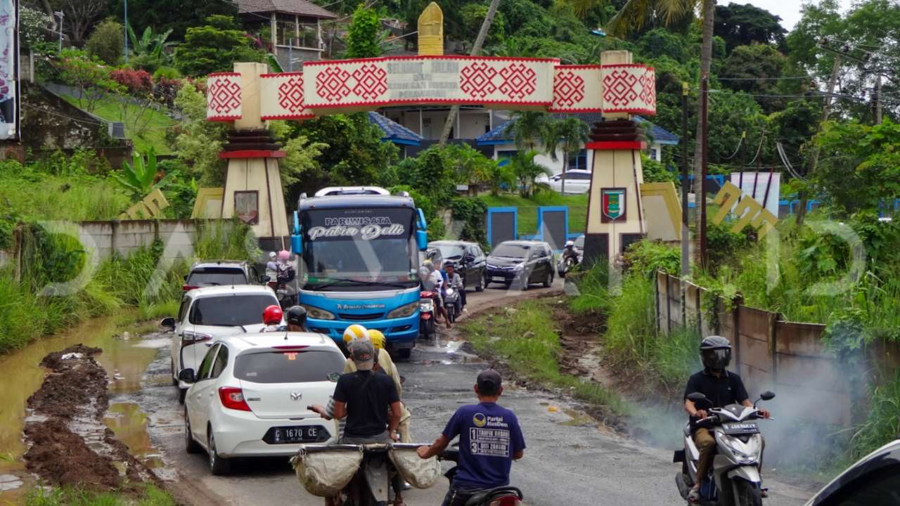 Tepat di bawah gapura perbatasan, jalan yang dipenuhi lubang dan genangan air bercampur tanah terlihat mengganggu arus lalu lintas.