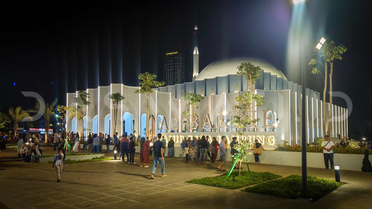 Masjid Raya Al-Bakrie di Enggal, Bandar Lampung, ramai dikunjungi warga pada malam hari usai diresmikan pada Jumat (12/9/2025) siang. Foto: Josua Napitupulu