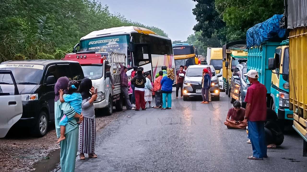 Macet saat arus balik Lebaran 2026 di Jalan Lintas Timur Sumatra, Bandar Durian, Kecamatan Aek Natas, Labuhanbatu Utara, Sumatra Utara, pada Sabtu (28/3/2026) pagi. Foto: Josua Napitupulu