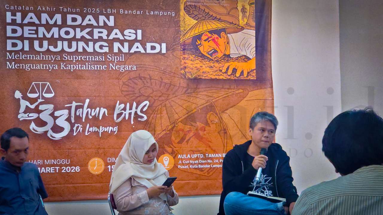 Lembaga Bantuan Hukum (LBH) Bandar Lampung resmi merilis Catatan Akhir Tahun (Catahu) 2025 bertajuk “HAM dan Demokrasi di Ujung Nadi” pada Minggu (1/3/2026) di Taman Budaya, Bandar Lampung.