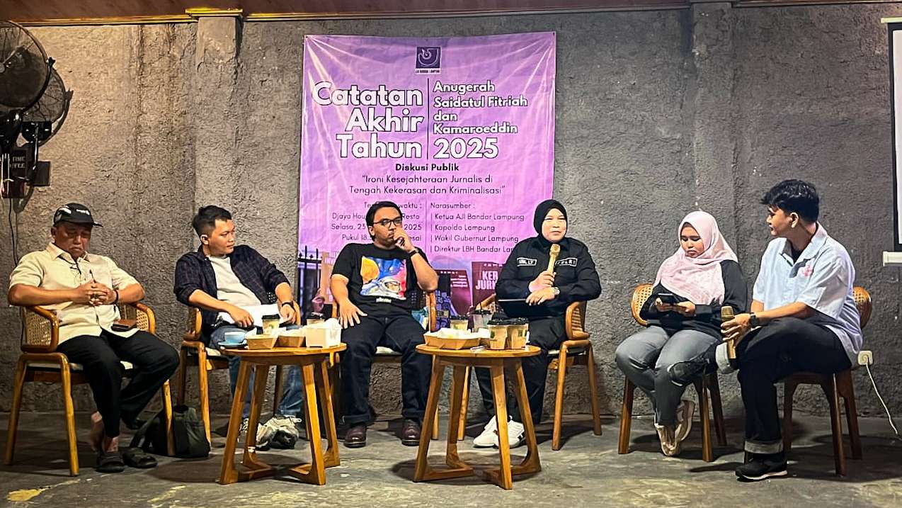 Aliansi Jurnalis Independen (AJI) Bandar Lampung merilis Catatan Akhir Tahun 2025 bertajuk “Ironi Kesejahteraan Jurnalis di Tengah Kekerasan dan Kriminalisasi”, yang memotret wajah buram industri media di Lampung, Selasa (23/12/2025).