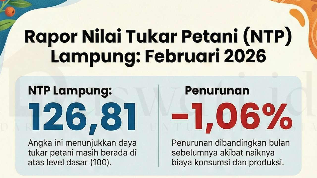 DASWATI.ID – NTP Lampung Maret 2026 turun 1,49% menjadi 124,92. Kenaikan biaya transportasi dan bensin menekan daya beli petani meski sektor perikanan tetap tumbuh positif.